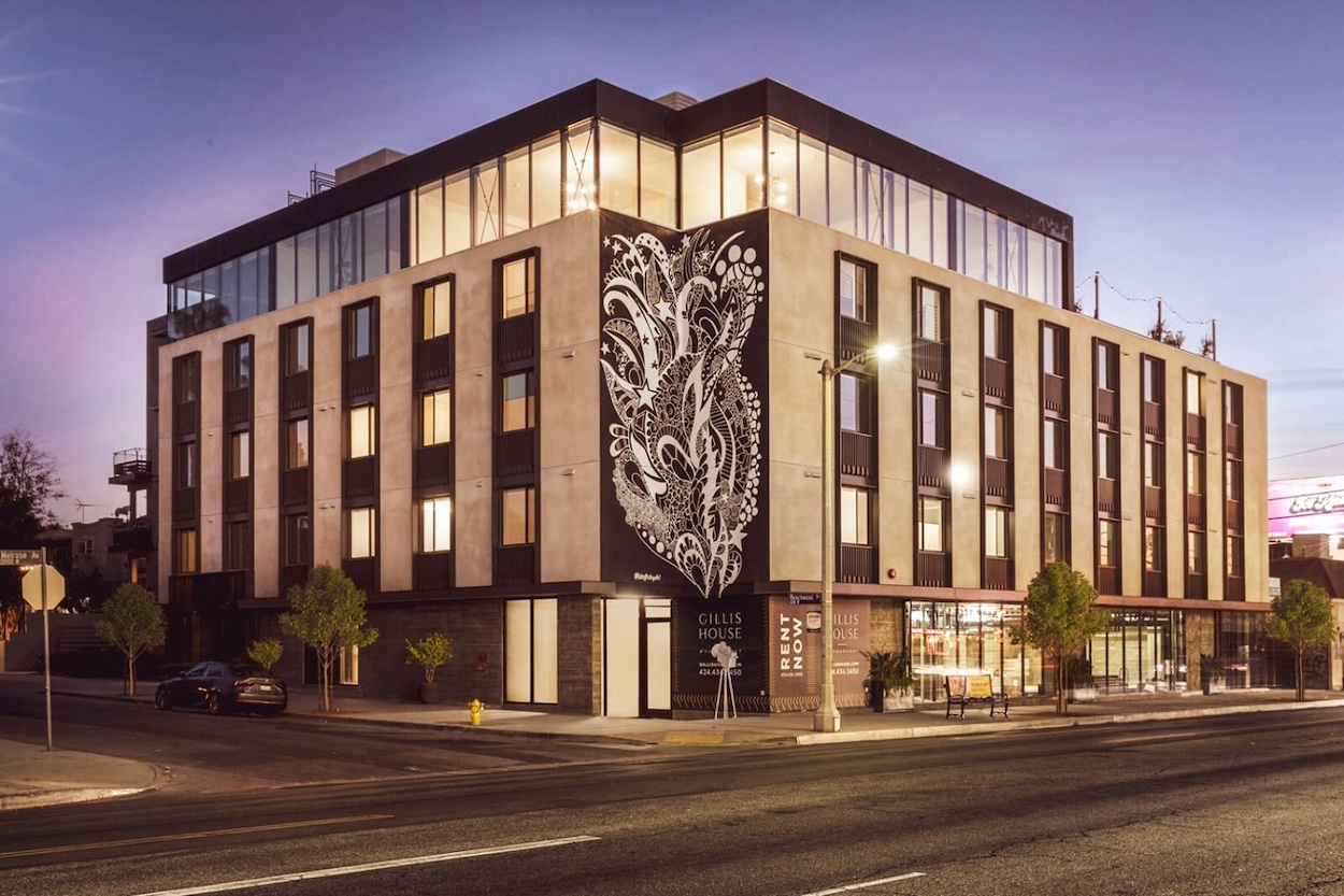 Gillis House features a rooftop deck with views of the Hollywood Hills, a sparkling swimming pool, and a fully equipped fitness center.